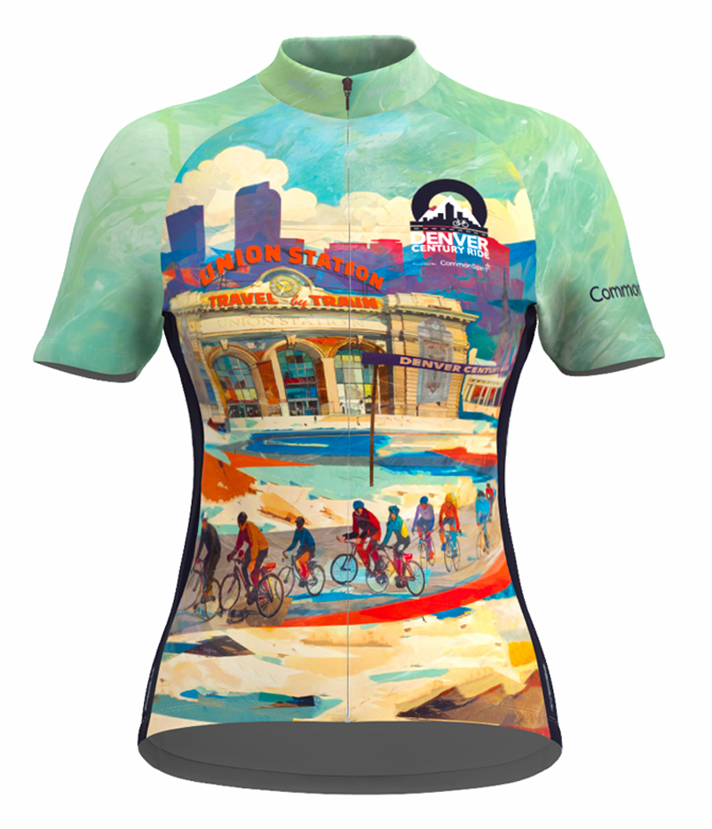 Front: Riders sweep past Denver’s iconic Union Station with the skyline and Rocky Mountains rising before them—a visual nod to where journeys begin and momentum builds. Bold color and dynamic lines capture the energy, history, and community at the heart of the Denver Century Ride.