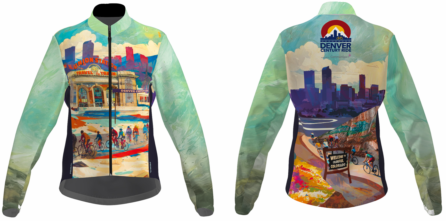 The Denver Century Ride merchandise collection features official ride apparel designed for performance, comfort, and everyday wear. Products include the Official 2026 Cycling Jersey, Wind Jacket, Arm Sleeves, and Performance Socks built for the ride, along with a Premium Hoodie perfect for pre- and post-ride comfort. Each item showcases distinctive 2026 CommonSpirit Denver Century Ride branding and is designed to celebrate Colorado’s cycling culture on and off the bike.